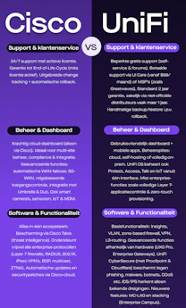 Meraki biedt zekerheid, betrouwbaarheid, uitgebreide enterprise-functies en langdurige ondersteuning, ideaal voor grote bedrijven die hun netwerk zonder zorgen willen beheren en eisen stellen aan stabiliteit, compliance of extreme schaalbaarheid. UniFi is vooral aantrekkelijk voor organisaties die kostenbewust opereren en zelf de expertise in huis hebben, of bereid zijn die in te huren. Zo krijg je veel netwerk voor relatief weinig geld, maar je moet er wel wat meer moeite voor doen, tenzij je het uitbesteed aan een partij als Greatwaves ;).