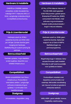 Op het gebied van compatibiliteit en toekomstbestendigheid scoort Meraki ook hoger. Cisco-infrastructuren werken breed samen met Meraki-hardware en de productlijn verandert zelden onverwacht. Je hoeft je dus geen zorgen te maken over producten die ineens uit het assortiment verdwijnen of onverwachte koerswijzigingen. Bovendien zijn software-ondersteuning en updates voor langere tijd gegarandeerd, wat zorgt voor continuïteit binnen je bedrijfsnetwerk. Dit maakt Meraki een veilige keuze voor bedrijven die inzetten op lange termijn.