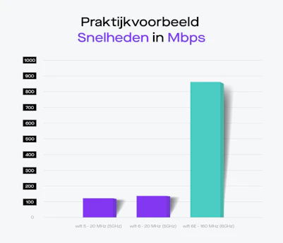 - Wifi 6E zenders kunnen enorme snelheden bereiken (900 mbit en hoger) Nooit zijn er zó veel nieuwe kanalen beschikbaar gekomen voor draadloos internet als bij wifi 6E. De nieuwe 6Ghz band is echt énorm! Deze nieuwe kanalen lossen een gigantisch probleem op: interferentie (storingen). In de afgelopen jaren is het aantal apparaten zo enorm hard gestegen dat de huidige wifi kanalen (op 2.4 en 5Ghz) dicht aan het slibben zijn. De beschikbaarheid van extra kanalen zorgt ervoor dat er een veel hogere snelheid gehaald kan worden (met gemak 900mbit!). Bovendien kan dit nu zonder dat je last hebt van andere wifi zenders of signalen van buren. Zo kunnen we voor het eerst in de praktijk écht gebruik maken van 160 mhz kanalen in plaats van de 20 Mhz kanalen, dit zorgt voor de enorme stap in prestatiewinst.
